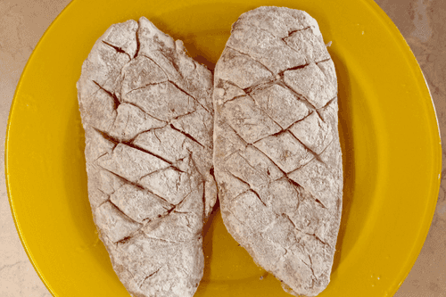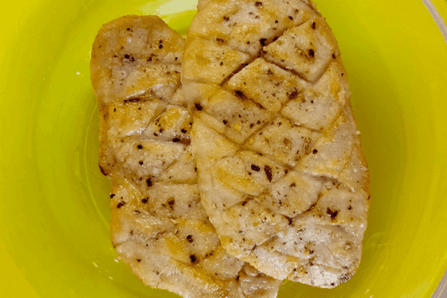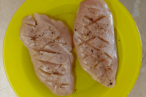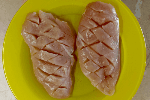 Wash the chicken breasts, dry them, and make cuts on one side with a sharp knife.