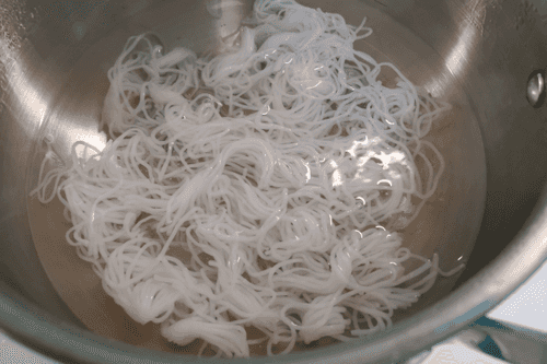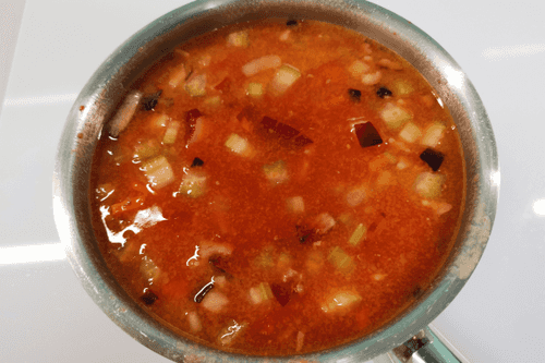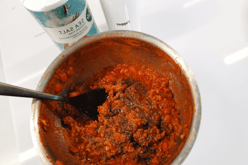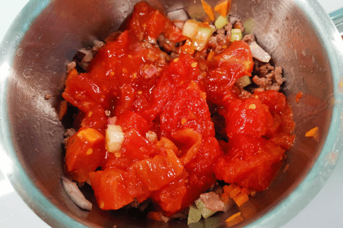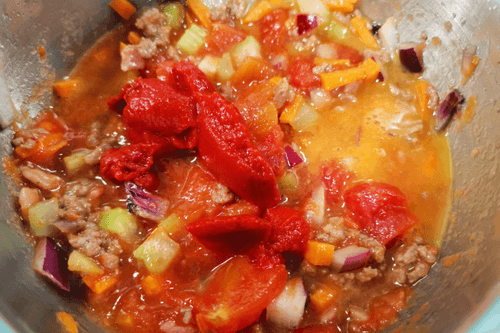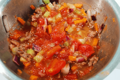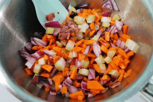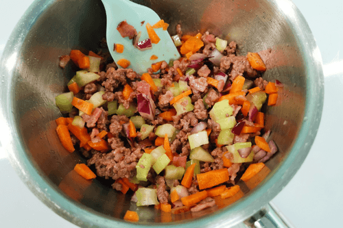 For the sauce, pour oil into a pot. Add finely chopped vegetables and minced meat.