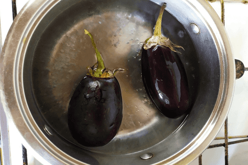 Boil the eggplants in salted boiling water until soft (5–7 minutes).
