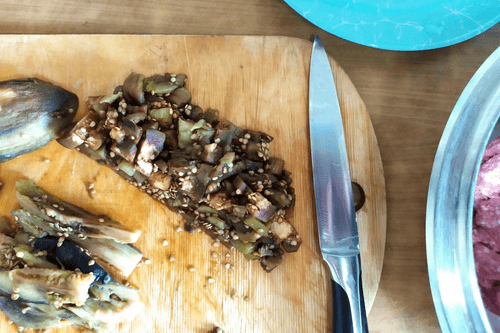 Cool the eggplants, peel them, and chop finely.