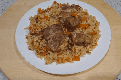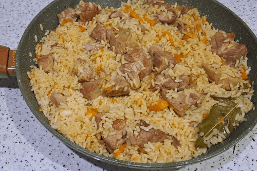 Pork neck pilaf in a pan is a harmony of flavors that combines juicy meat, aromatic spices, and tender rice. Although traditionally associated with Eastern cuisine, this version fits perfectly into European culinary traditions. The rich flavor of pork adds special depth to the dish, while the spices reveal its rich bouquet. Onions and carrots add a sweet note, while garlic and bay leaves provide spiciness. The pilaf is relatively simple to prepare, and frying the meat before stewing helps retain its juiciness. This dish is perfect for a family dinner or a friendly gathering, offering warmth and rich taste. It is served hot and pairs wonderfully with fresh vegetables and herbs.