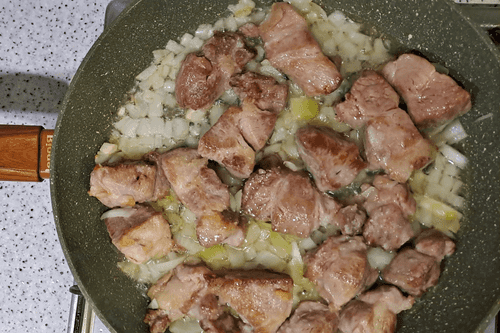 Peel the onion, wash it well under running water, cut it into strips or cubes, add it to the pan with the meat, and season everything to taste.