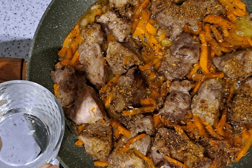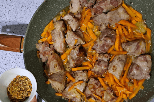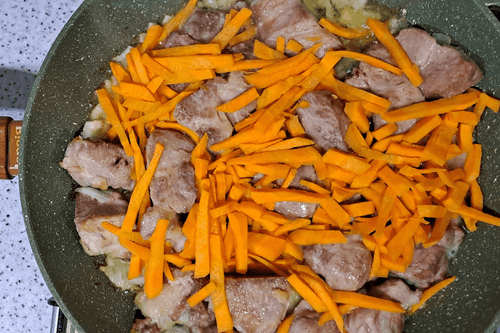 Peel the carrot, wash it well, cut it into large sticks, and place it in the pan with the meat and onion. Fry over medium heat until the vegetables are golden.