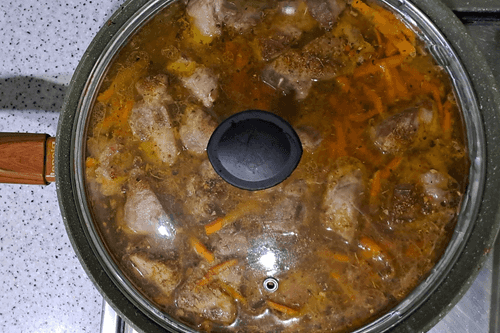 Cover the pan with a lid and simmer the meat until half-cooked for about 30 minutes on low heat.