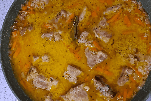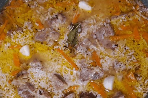 Drain the water from the rice. Place the rice in the pan with the meat, add 2 bay leaves. If necessary, add a little water to cover the rice and salt to taste.