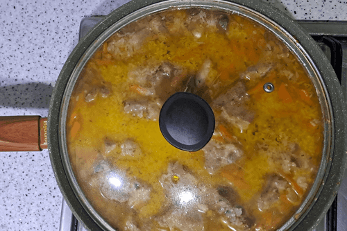 Cover the pan with a lid, bring to a boil, and simmer on low heat until the pilaf is ready.