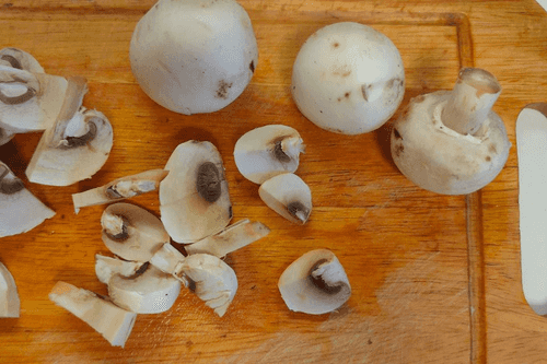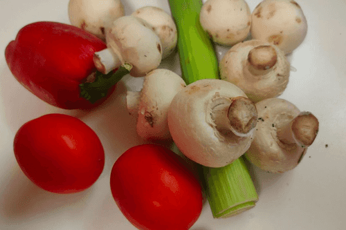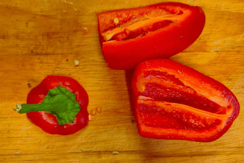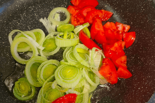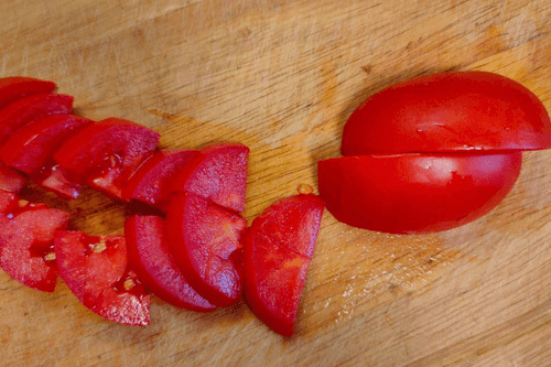 Cut the tomato in half, then into quarters lengthwise and into pieces crosswise.