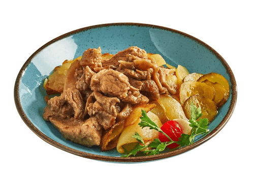 Pork in beer is a true reflection of Czech gastronomy, where simplicity meets depth of flavor. This recipe has roots in traditional taverns of Prague, where aromatic meat dishes are perfectly complemented by a mug of fresh beer. Tender pork neck infused with malty notes of light beer gains remarkable softness and richness of taste. Oyster mushrooms add a light earthy bitterness, while onions highlight the sweet and caramelized tones of the meat. Crispy potatoes fried to a golden crust make an ideal side dish, and fresh pickled cucumbers and juicy cherry tomatoes finish the composition with a light tanginess. This dish not only delights the palate but also offers a sense of comfort and traditions of old Europe, making every dinner special.