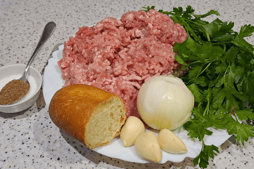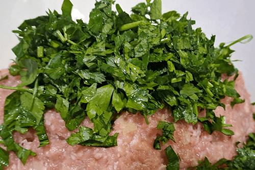 Wash the parsley well under running water, dry it, chop it finely, and add it to the minced meat. Mix all the ingredients well.