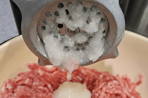 Peel the onion, wash it well under running water, cut into pieces, pass through a meat grinder, and add to the minced meat.