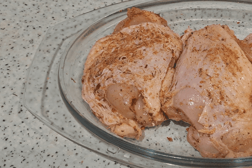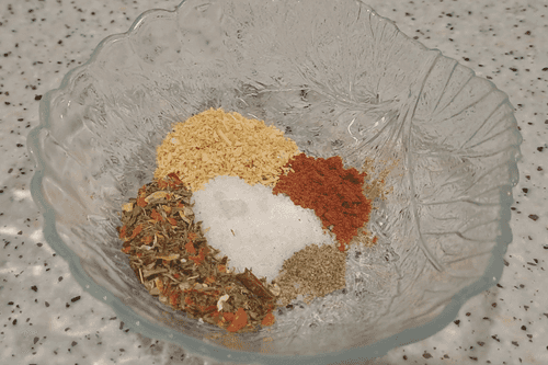 In a separate container, place 2 teaspoons of ground dried garlic, salt and pepper mix to taste, 1 teaspoon of chicken seasoning, and mix all the spices well.