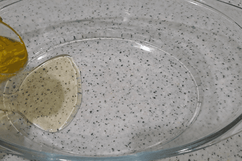 Wash the rice well under running water, place it in a baking dish, and salt to taste.