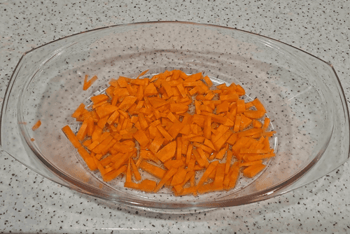 Peel the carrot, wash it well, dry it a little, cut it into strips, and place it in a baking dish.