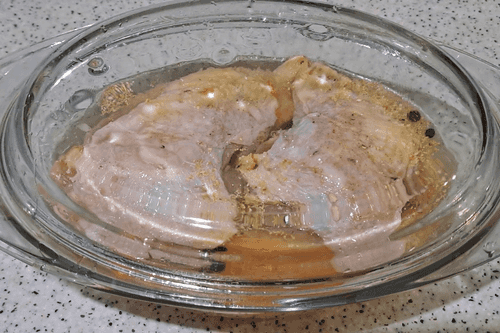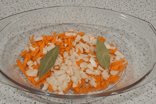 Peel the onion, wash it well under running water, cut it into strips, and place it in a baking dish. Add 2 bay leaves.