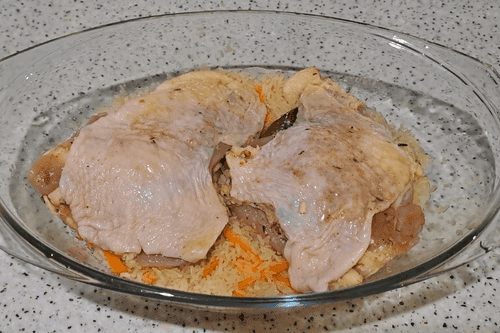 Place the prepared chicken thighs on the rice, pour 2 cups of water into the dish (1 cup = 200 ml). Add 4 peppercorns to the dish.