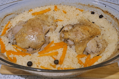 Baked rice with chicken thighs is a classic dish of European cuisine that combines simplicity in preparation and richness of flavor. Tender, aromatic chicken thighs infused with spices are baked together with rice, carrots, and onions, creating a harmonious dish with a rich taste and appetizing aroma. Bay leaves and allspice add light spicy notes, making each spoonful truly cozy. This dish is perfect for a family dinner or festive table. It is nutritious, filling, and balanced while requiring minimal effort to prepare. Baking in the oven makes the rice soft and absorbs all the aromas of spices and chicken juice, creating an incredibly delicious and rich texture. It’s an ideal option for those who appreciate simplicity and magnificent taste.