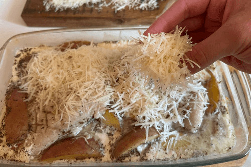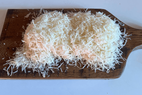 While the duck and potatoes are cooking, grate the cheese on a fine grater.