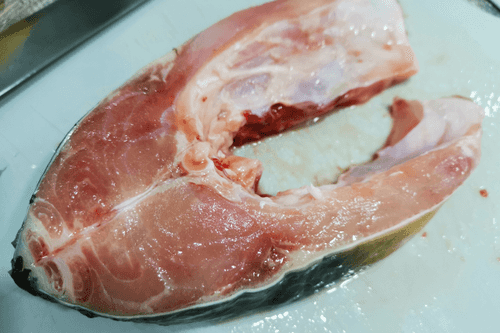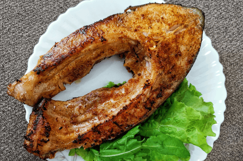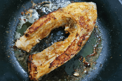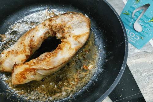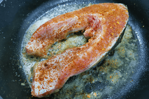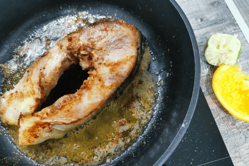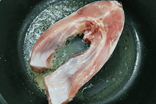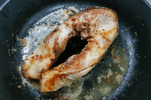 Carp steak in a frying pan
