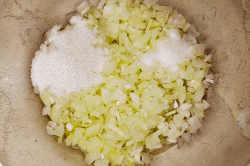 Marinate the onion: add 1 teaspoon of salt, 2 teaspoons of sugar, rice vinegar to a bowl with onion, pour in 150 ml of hot boiled water, and cover with a lid.