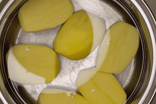 Peel the potatoes, cut them, cover with water, and boil until cooked.