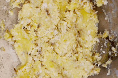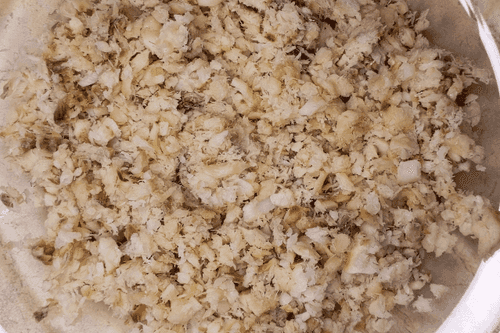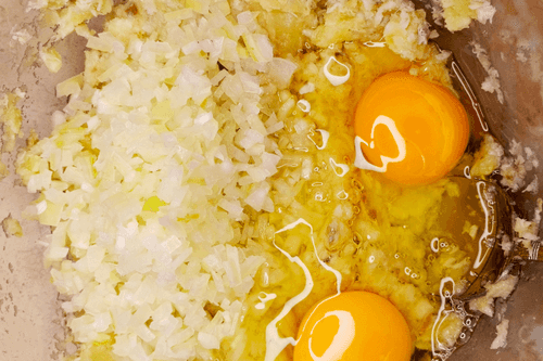 Drain the onion and dry it with a paper towel. Add the onion to the fish-potato mixture with 2 eggs and mix.
