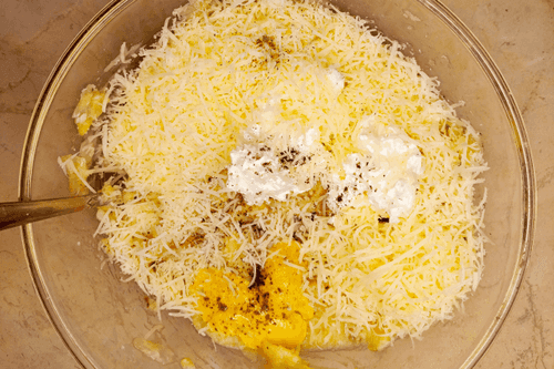 Add grated cheese, soft cheese, pepper, mustard, salt, and mix.