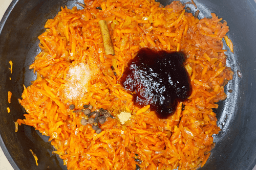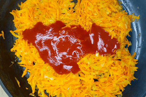 Add tomato paste to the carrots with onions, stir, and simmer for 3 minutes.