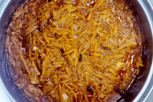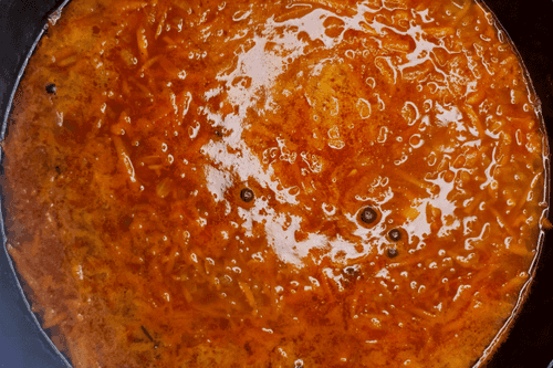 Add 100–150 ml of water and simmer until the carrots and onions are cooked.