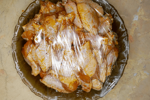 Add spices, soy sauce, garlic pressed through a press, vegetable oil, and mix the wings well with the marinade.