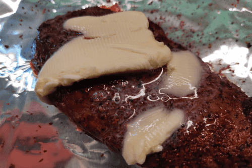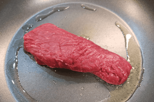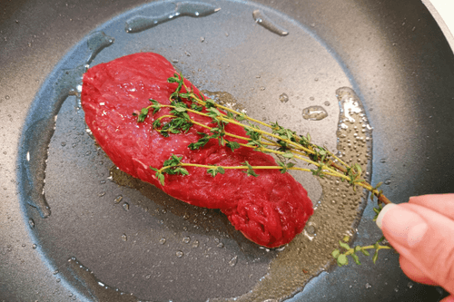 Dip a sprig of thyme in oil, lightly pound the meat with it, and place it on top.