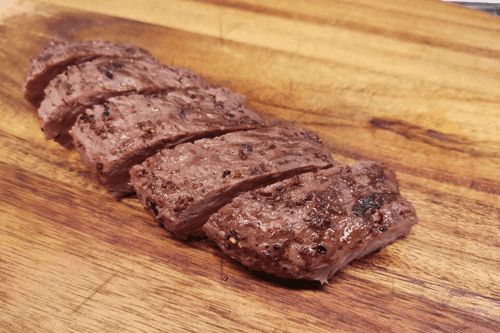After 5 minutes, transfer the steak to a plate and slice it into portions.
