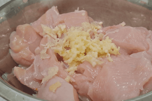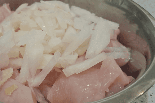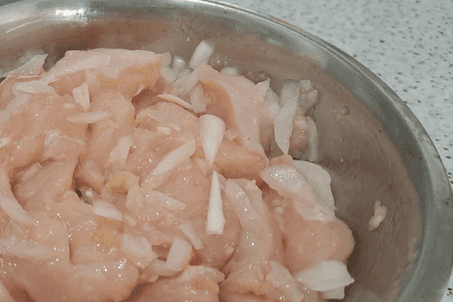 Wash the meat well under running water, dry it a little, cut it into medium-sized cubes or strips, and place it in a separate container.