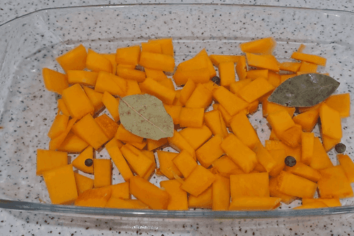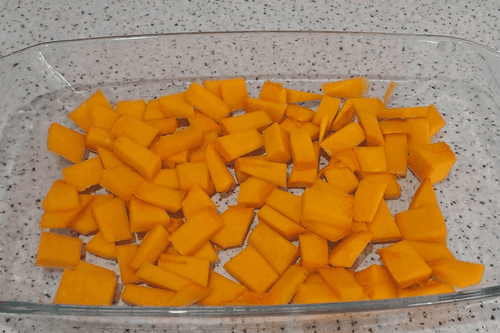 Peel the pumpkin, wash it well under running water, cut it into medium-sized cubes or strips, and place it in a baking dish.