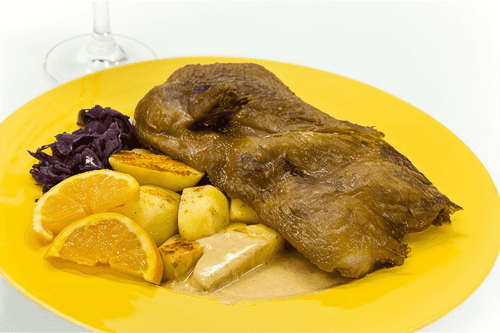 Roast duck with potatoes and sauce is a classic dish of European cuisine that combines rich flavors and exquisite presentation. The duck, infused with the aromas of spices and orange juice, acquires a tender texture and golden crust. The potatoes, cooked in duck fat with rosemary, become crispy on the outside and soft on the inside, complementing the main dish with their richness. The sauce, made from duck fat, flour, and vegetable broth, adds depth to the flavor profile. This dish is perfect for festive gatherings, impressing guests with its refined aroma and rich taste. Its origin is linked to traditional French cuisine where duck dishes have always held a prestigious place at the table, highlighting the richness of gastronomic culture.