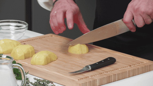 Cut the potatoes randomly. The smaller the pieces, the faster they will cook.