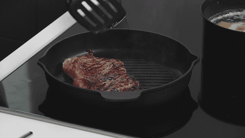 Preheat the grill pan well, place the steak on it, and cook for 2-2.5 minutes on each side for medium rare.