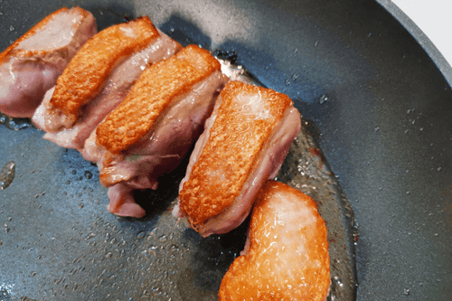 Place the duck skin-side down in a dry heated skillet. Sear on high heat for 2-3 minutes until golden brown.