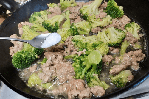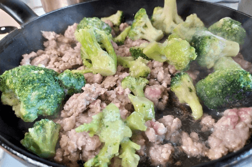 Add broccoli to the minced meat. Mix and simmer covered for 5-7 minutes.