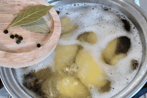 Boil the potatoes in salted water, adding bay leaf and peppercorns.