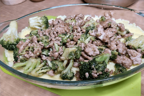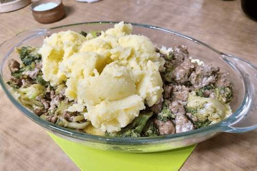 Potato casserole with minced meat and broccoli