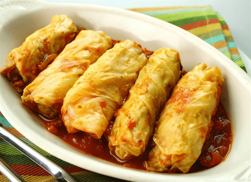 Place the prepared cabbage rolls in the dish with the folded edges down, and arrange cinnamon sticks between them. Season with salt and pepper, then add tomatoes that have been peeled and chopped coarsely on top. Cover with a lid and bake in the oven at 180 degrees for one hour.