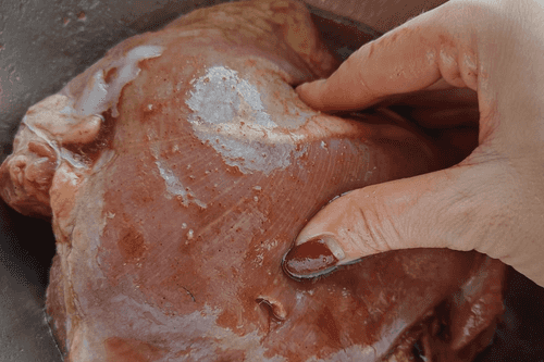 Massage the turkey thigh well with your hands, rubbing in the marinade.
