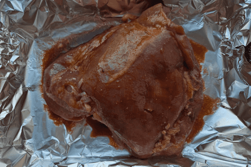 Lay the foil in the baking dish and place the meat.
