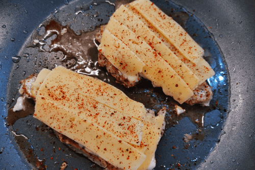 Place cheese slices on top and season with chili pepper.
