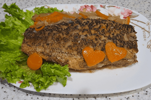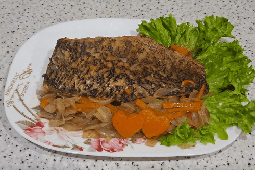 Fillet of bighead carp baked in the oven with soy sauce, onion, and carrot is a harmony of flavors and aromas. This recipe combines the tender texture of fish with the rich spiciness of soy sauce, the sweetness of carrots, and the softness of onions. European cuisine, known for its attention to detail, has gifted this cooking method to the world, allowing the fish's juiciness to be preserved while highlighting its natural taste. Baking in the oven makes the dish light and healthy, while marinating in spices reveals depth of flavor. It is perfect for cozy home dinners as well as festive tables. Served hot or chilled, herbs add freshness to each piece. Such a dish will adorn any feast, bringing delight to everyone who tries it.