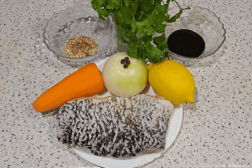 Peel the carrot, wash it, cut it into strips, and place it next to the fish, adding 6 peppercorns.