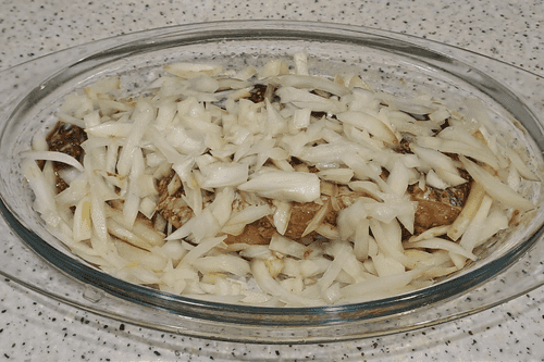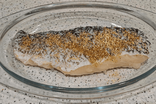 Wash the fillet of the bighead carp well under running water, dry it with a paper towel, place it in a baking dish, salt to taste, and sprinkle with fish seasoning.