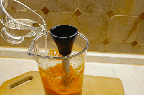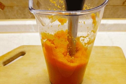 Transfer the carrot and garlic to a blender, adding 2 tablespoons of the water they were cooked in, and olive oil.