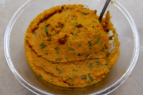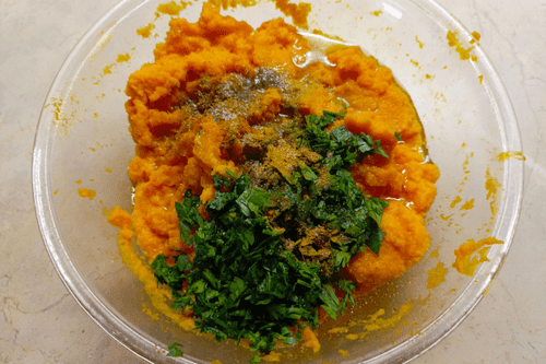 Add spices, salt, herbs, and lemon juice to the puree, and mix well.