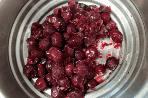Place the frozen berries in a strainer, but do not fully thaw the cherries to prevent them from releasing juice.